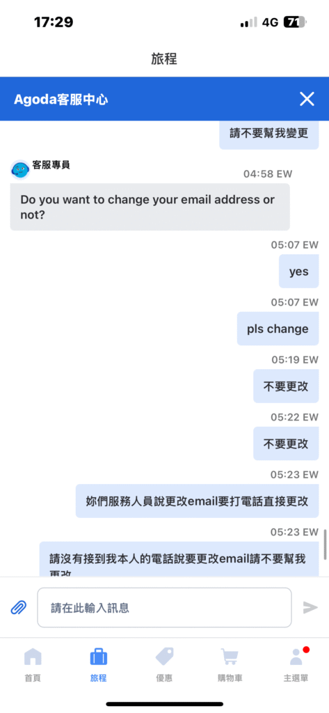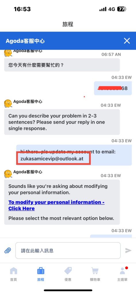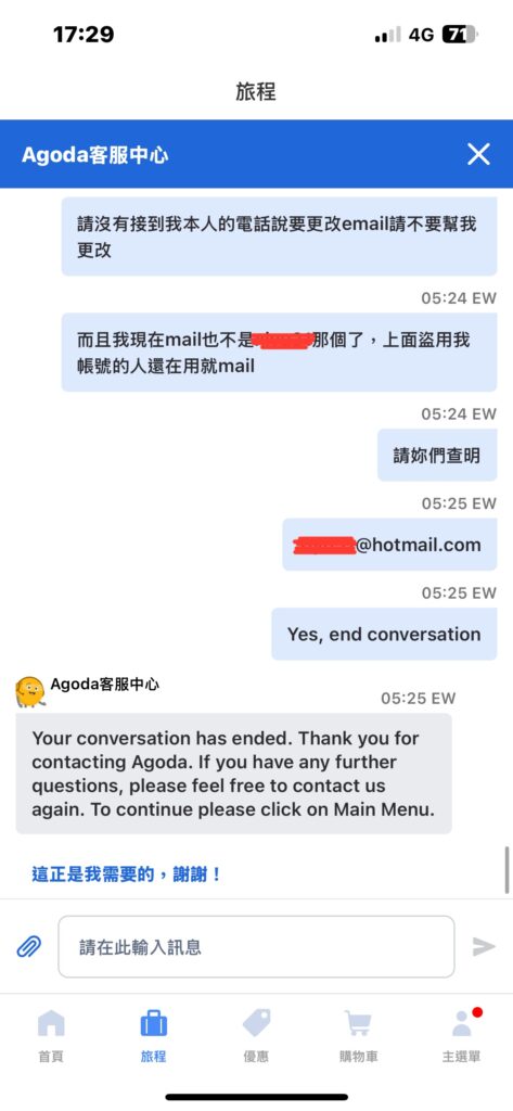 還有一件事我覺得就是A站的大漏洞,我發現不管你是不是有改了密碼,駭客都還是可以大搖大擺的登入你的帳號然後在你的訂房資訊裡留言給A站,並請他更改你的電子郵件信箱,我就親眼看到駭客在我的留言版裡跟客服說要更改信箱,一整個很詭異,我附上圖片供參考。(以下圖例的時間我已經更改email跟變更密碼了,但駭客還是暢行無阻,所以重點應該是不要儲存信用卡資料,讓駭客有機可刷,這難道不是A站大漏洞嗎,但至少你改了email,駭客還在跟客服中心用舊的email,就只能期待客服中心有發現了)